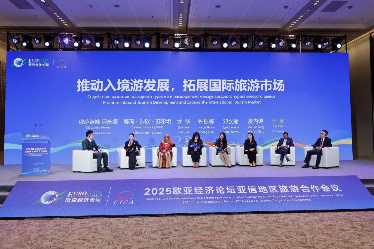 9月23日—24日,2025欧亚经济论坛亚信地区旅游合作会议在西安国际会议中心举行。本次会议以“加强对话协作,共绘旅游新篇”为主题,陕西省副省长徐明非、亚洲相互协作与信任措施会议秘书处副秘书长张凌、阿塞拜疆共和国国家旅游司司长埃尔贡•贾瓦多夫、哈萨克斯坦共和国驻西安总领事馆总领事克拉巴耶夫•佐齐汗分别致辞。西安国旅总经理任宏、总经理助理兼入境旅游中心总经理于强受邀参加会议,探讨区域旅游合作新机遇,助力陕西旅游升级。
